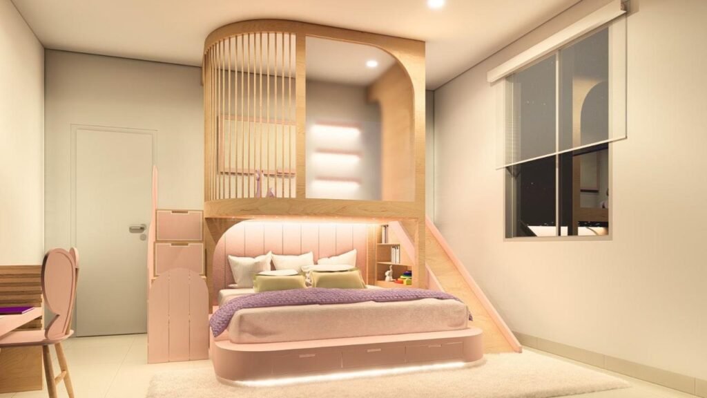 Camarote elaborado en flor morado y Rh, cama para colchón 100×190 cm, pared tapizada con luz led, 3 cajones inferiores, biblioteca en los dos niveles de la cama con luz led, zona de juegos o cama 100×190 cm, escalera de 5 cajones.