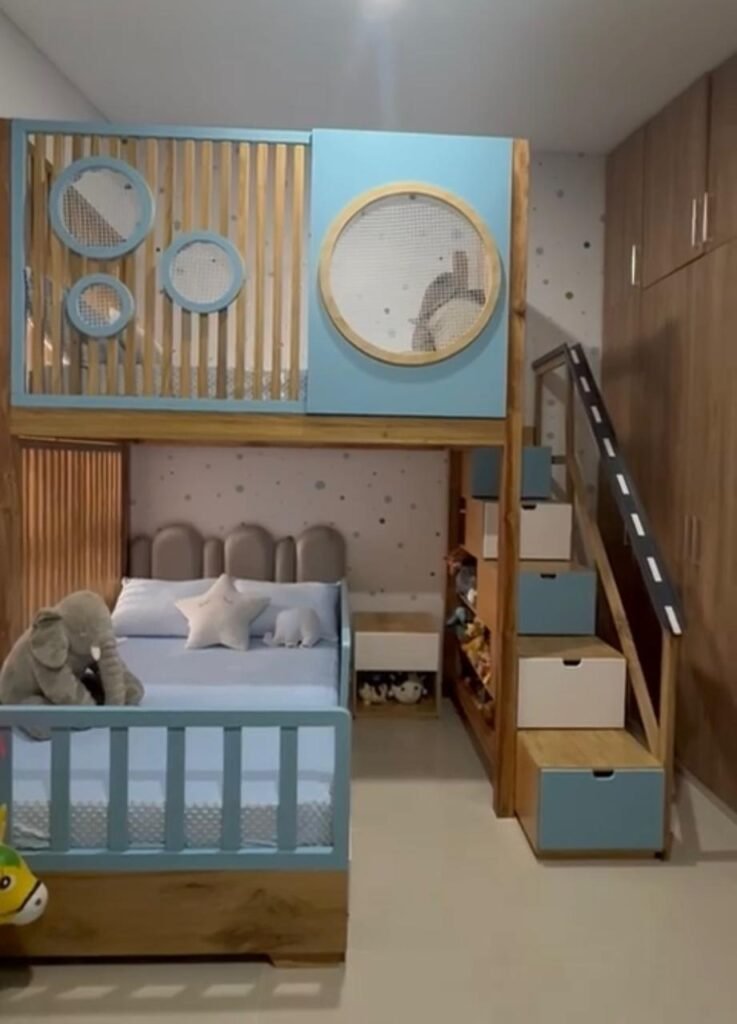 Camarote elaborado en laurel, cama tapizada independiente para colchón 100×190 cm tapizado en cabecero y dos barandas removibles, zona de juego o cama 100×190 cm, estructura en madera con circulos, escalera 5 cajones, pasamanos con pista para carros.