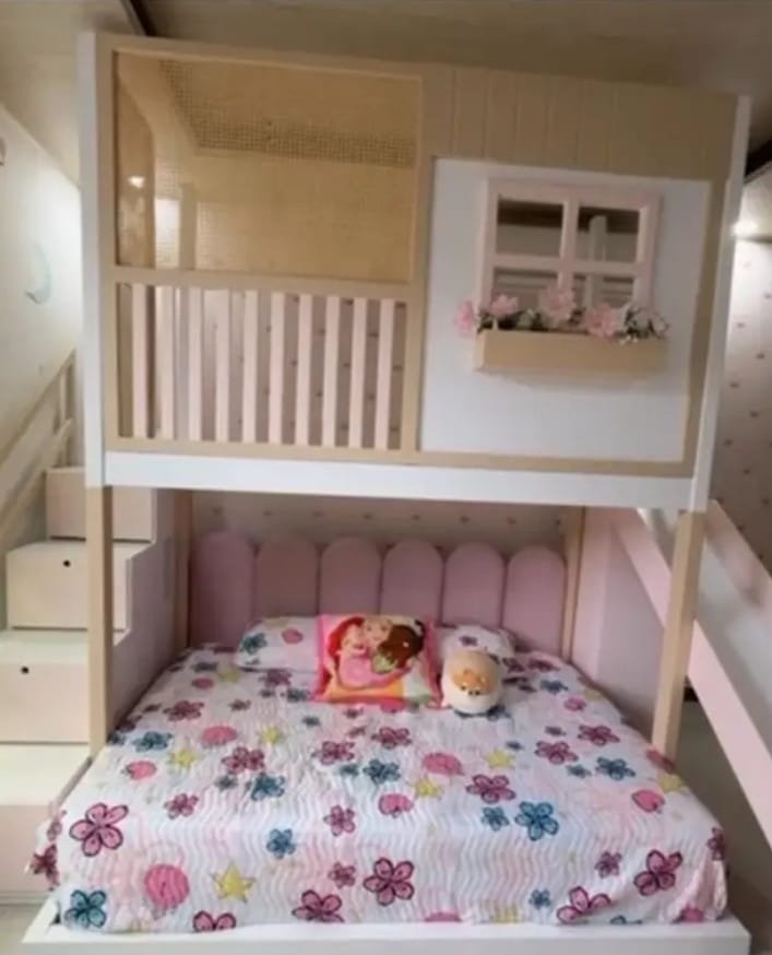 Camarote elaborado en flor morado, 1 cama para colchón 100x190cm, zona de juegos o cama 100x190cm, pared tapizada, escalera de peldaños, barandas en madera y cuerda, baranda removible con mimbre, un cajon y un espacio.