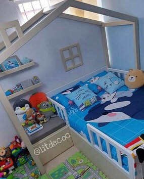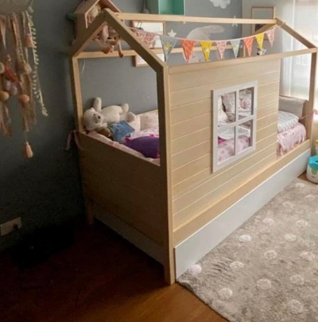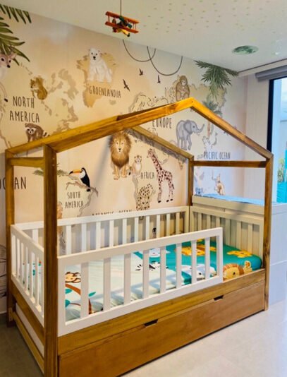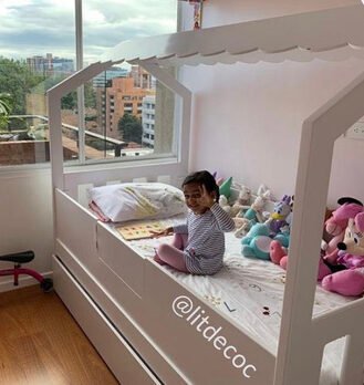 Cama cuna elaborada en cedro para colchón 100×190 cm, cama auxiliar 100×180 cm, barandas removibles, pared de casita una ventana, tu eliges el color.