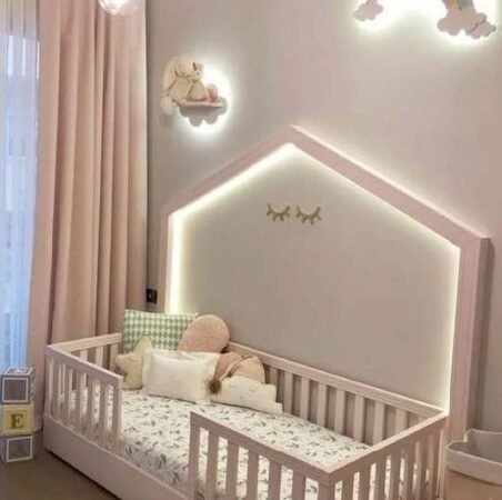 Cama elaborada en Cedro para colchón 100×190 cm, barandas removibles. tu eliges el color, estructura en forma de casa con luz led.