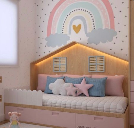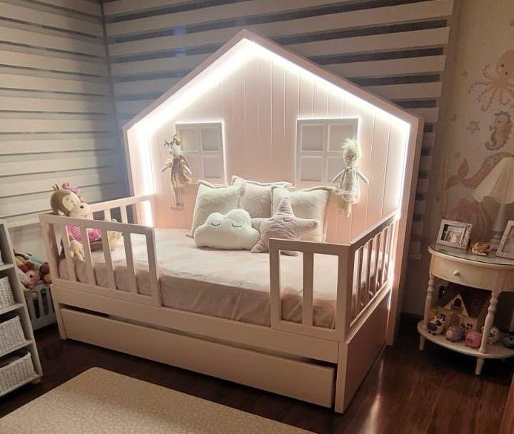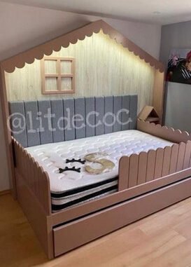 Cama elaborada en Cedro para colchón 100×190 cm, cama auxiliar 100×180 cm, barandas removibles, tapizado 190×60 cm, tu eliges colores, casita, techo, fondo, con ventana y luz led, repisa en lateral derecho.