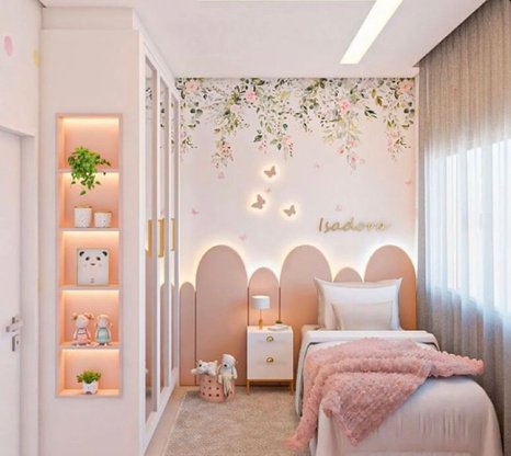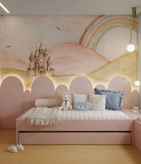 Cama elaborada en Cedro para colchón 100×190 cm circular, cabecero de conejito, con luz led.