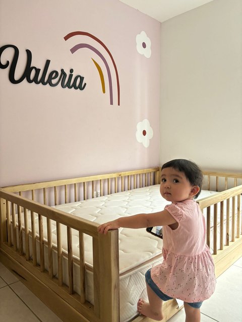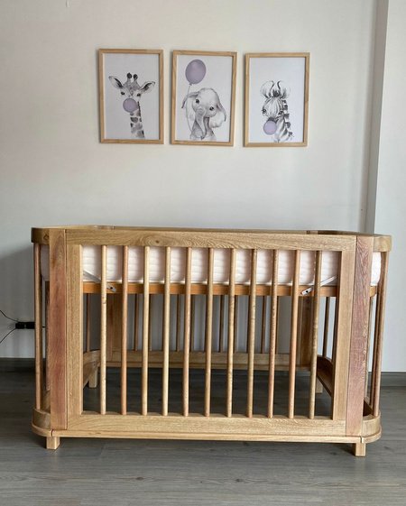 Cuna elaborada en roble flor morado, para colchón 130×70 cm, 3 niveles para colchón, baranda removible para colecho.