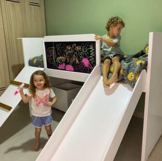 Cama alta elaborada en Cedro para colchón 100×190 cm, baranda-tablero, escalera, rodadero, 2 cajones para almacenar juguetes.
