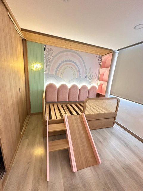 Cama elaborada en flor morado para colchón 100×190 cm, cama auxiliar 100×180 cm, barandas con mimbre removibles cabecero tapizado con luz led, rodadero y escalera