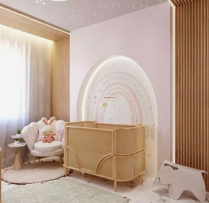 Cuna elaborada en roble flor morado, para colchón 130×70 cm, 3 niveles para colchón, toda forrada en mimbre.