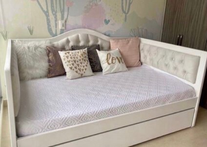 Cama elaborada en Cedro para colchón100x190 cm, tapizado 50×200 cm y dosde 35×100 cm, cama auxiliar 100×180 cm.
