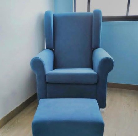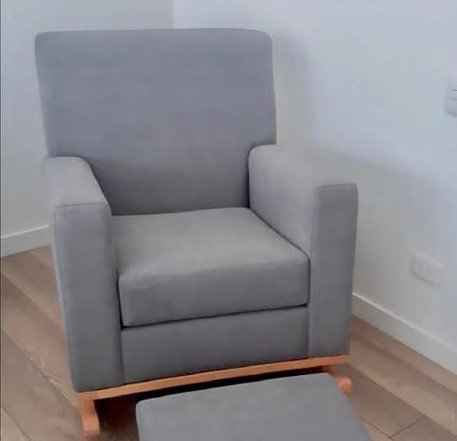 Mecedora tapizada en la tela de tu elección, con descansa pies, patas en cedro.