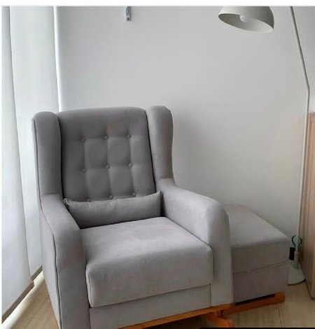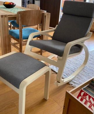 Mecedora elaborada en madera laurel, tapizada en la tela de tu elección, con descansa pies.