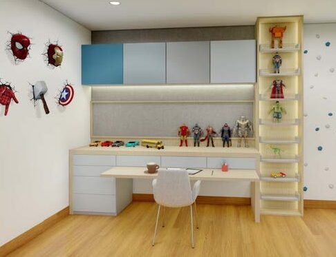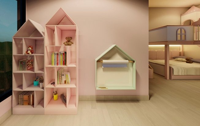 Repisas elaboradas en MDF 15 mmdel color de tu elección, 60x150x35cm y 70x130x35 cm.