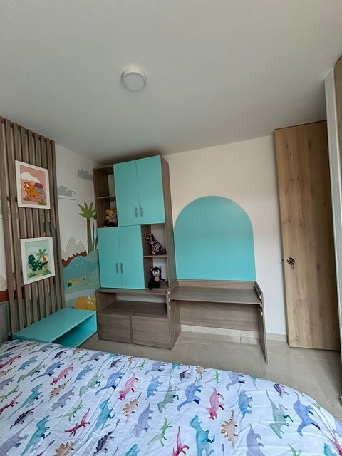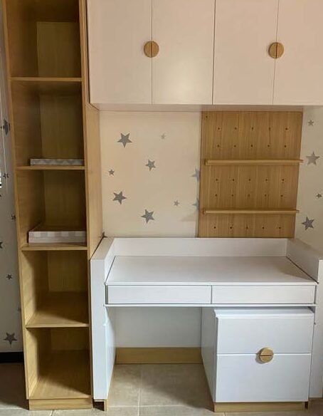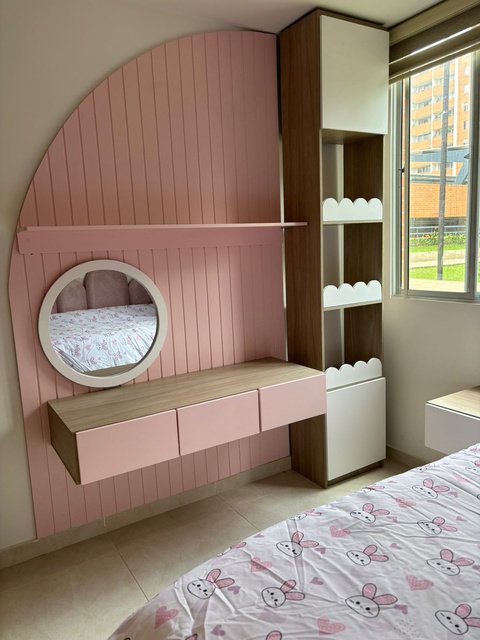 Escritorio en Rh y MDF 15 mm,120x40x70 cm, espejo de 45 cm dediametro, palillera 140×220 cm, repisa120x15 cm, mueble vertical 40x238x30cm.